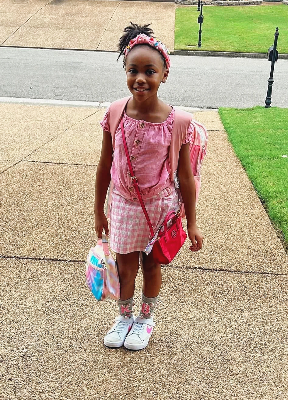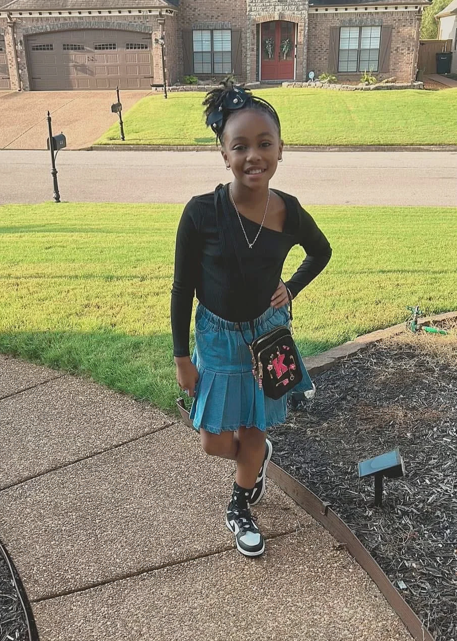 • A young girl with styled hair, wearing a black t-shirt, distressed baggy jeans, and sneakers, posing on a carpeted staircase with her arms outstretched, smiling at the camera.